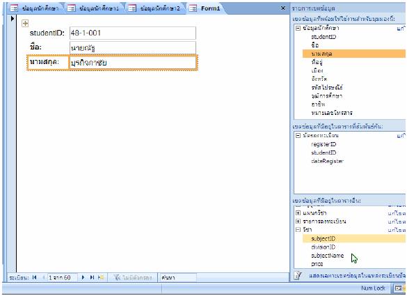 รูปที่ 5-14 ลากเขตข้อมูลจากตารางวิชาลงมาในฟอร์มเปล่าที่มีเขตข้อมูลของตารางข้อมูลนักศึกษา